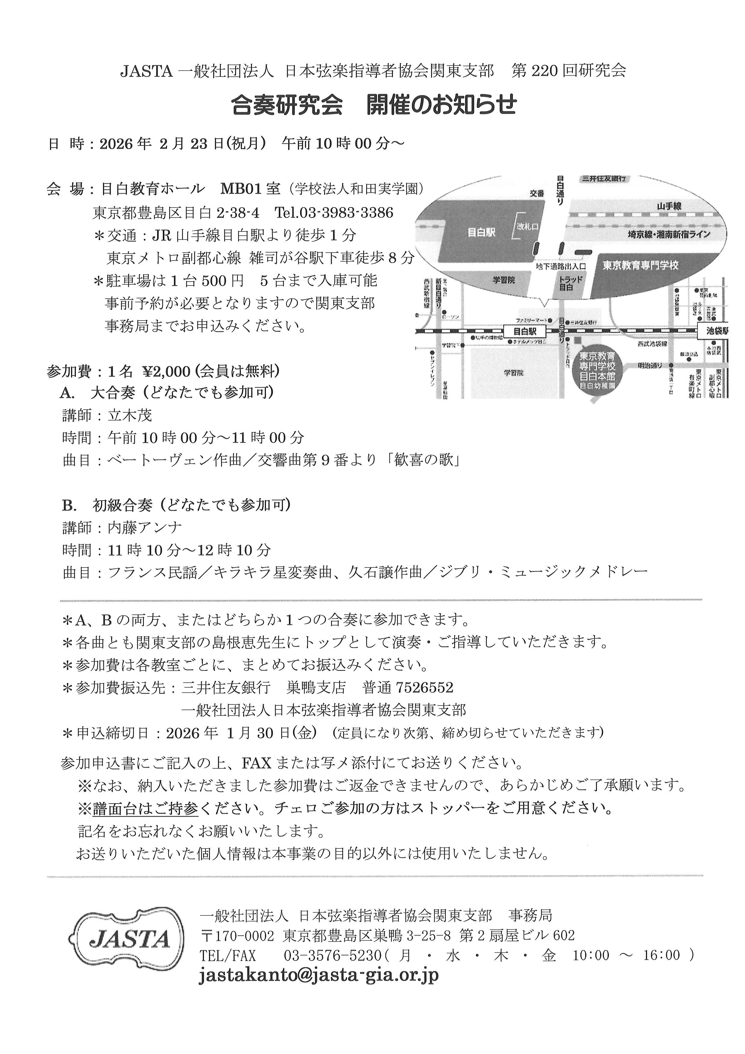 2026年2月23日(祝月)関東支部主催 合奏研究会を開催いたします。概要をご案内いたします。